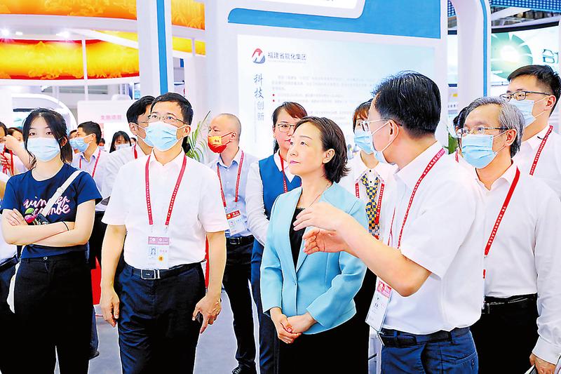 展会期间,福建省委常委、常务副省长郭宁宁(中)一行巡馆至能化集团展位,了解集团在新型清洁能源开发利用、福建石化产业“两基地一专区”建设等方面的情况。图为集团副总经理朱玉武(右一)向郭宁宁介绍集团相关情况。(安迪 悦心 摄影报道)