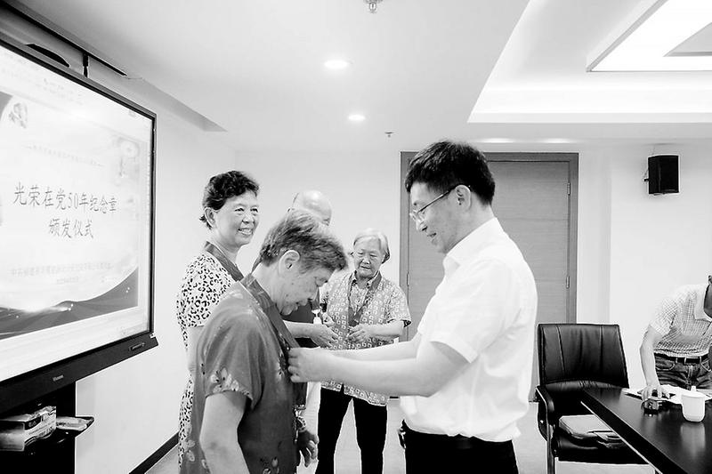 6月21日,华厦设计院举办“光荣在党50年”纪念章颁发仪式。图为华厦设计院党委副书记、总经理施忠雄为老党员佩戴纪念章。