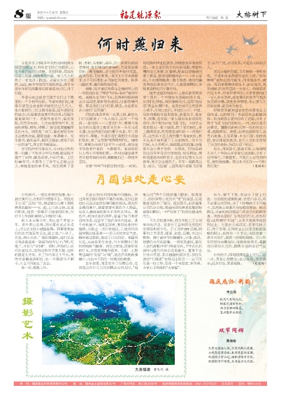 又是秋季,时隔多年我再次回到故乡探望舅舅,记忆里的老宅院已经翻新,心里不免泛起丝丝遗憾。老屋拆除,那窝在房梁上筑巢,伴随着我外婆一家几代人的燕子一家也没了踪迹。老屋完全变了模样,从此,50多年坚固不变的老屋,燕子为邻年年新的温馨亲切画面成为记忆,没了归宿。