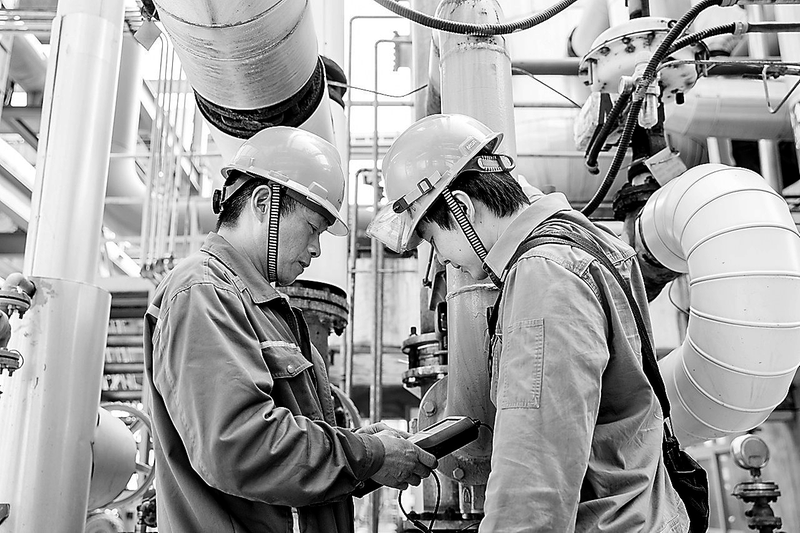 图为蔡鑫英(左)在现场检查调校仪表设备