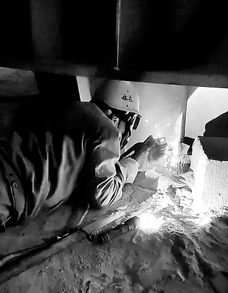 狭窄空间作业是电焊工最不愿面对的挑战之一。王余斌慢慢地趴在地上,缓慢爬入检修口。进入后,他只能保持趴着的姿势进行补焊,空间限制使其技术效果大打折扣。补焊开始后,狭小空间迅速被刺鼻的烟尘填满,即便有防护面罩,眼睛仍感到灼热。虽然此时室外的气温是零下1摄氏度,但电焊现场的温度却较高。一会儿,豆大的汗珠从他的额头滑落,在面罩内形成细小的水流,每一次呼吸都显得沉重,但他的手稳如磐石。